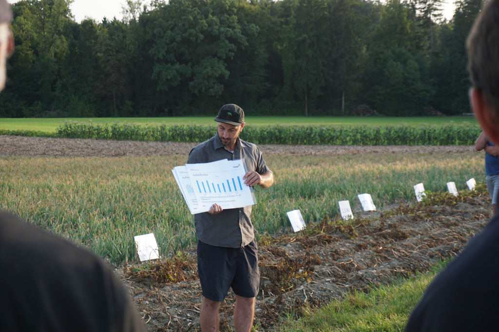 August 2025 - Über 30 Produzenten nutzten jeweils die Gelegenheit, sich direkt vor Ort über aktuelle Versuche und Praxisfragen auszutauschen. Gastgeber waren Urs Steinmann bei den Zwiebelproduzenten sowie die BG Neuenschwander für die Kartoffelproduzenten. Neben den Versuchsleitenden vom Arenenberg brachten weitere Fachleute ihre Expertise ein.